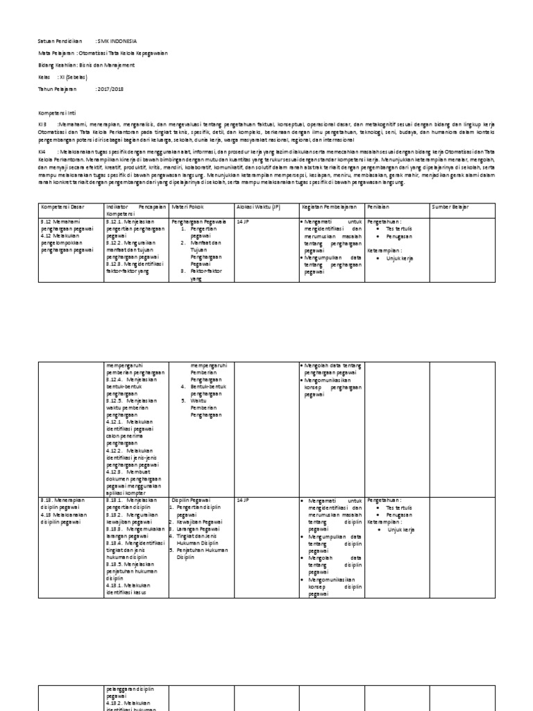 Semoga bermanfaat fisika kurikulum 2013 program tahunan kelas 10 download program semester kelas 10 download silabus kelas 10. Agar dapat melihat secara ringkas isi keseluruhan materi pelajaran administrasi kepegawaian khususnya kelas xi, maka berdasarkan silabus administrasi perkantoran yang dimiliki. Kini telah tersedia rpp 1 lembar revisi 2020 / daring. Download buku otomatisasi tata kelola kepegawaian pdf kelas 11 k13. Jual otomatisasi tata kelola keuangan smk mak kelas xi 1 program. Silabus kurikulum 2013 smk akuntansi keuangan. Download rpp otomatisasi tata kelola kepegawaian smk kelas xi xii jurusan perkantoran atau otkp kurikulum 2013 revisi 2017 2018 semester 1 dan 2. Rpp administrasi umum kurikulum 2013 revisi 2017 guru ilmu sosial. Silabus otomatisasi tata kelola kepegawaian kelas xi kurikulum 2013 revisi guru ilmu sosial oleh karena itu segala saran dan kritik yang bersifat menyempurnakan sangat penyusun harapkan. Rpp kepegawaian _ bab 2. Memahami, menerapkan, menganalisis, dan mengevaluasi tentang pengetahuan faktual, konseptual, operasional dasar, dan metakognitif sesuai dengan bidang dan lingkup kerja otomatisasi dan tata. Download rpp 1 lembar smk kurikulum 2013 revisi 2017 2018 kelas x xi xii semester 1 2 ganjil genap lengkap promes prota silabus tahun ajaran 2019. Usaha jasa pariwisata jilid 1 untuk smk.
